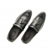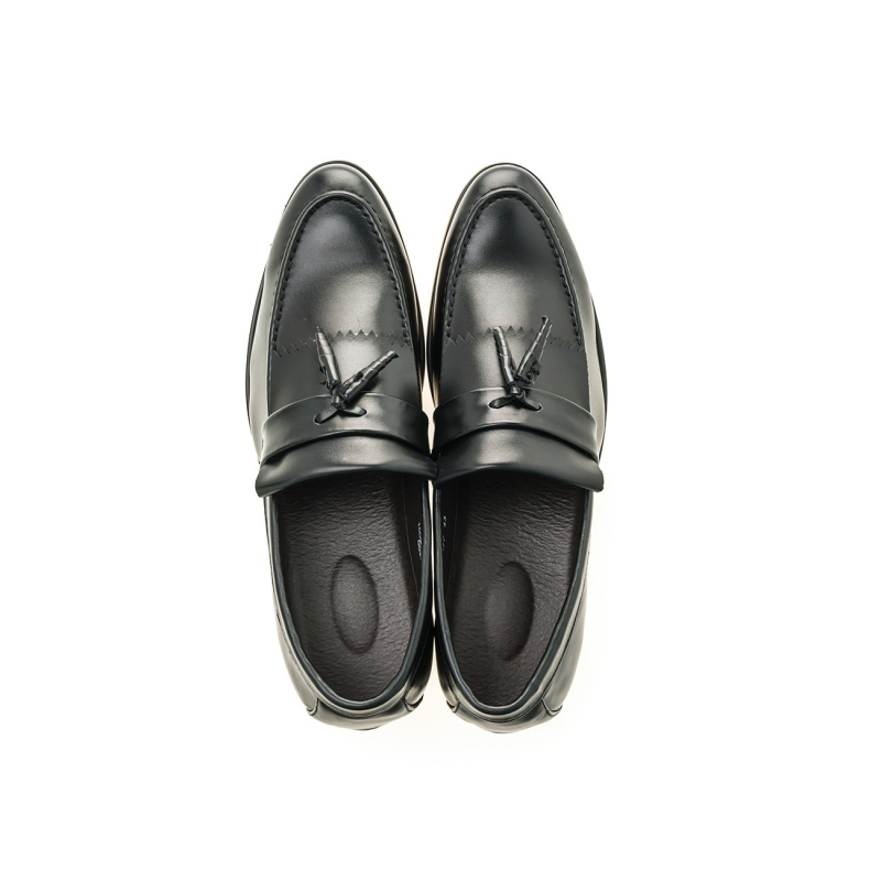 A pair of Black solid pointed toe formal slip-ons has tassel moccasin, has a slip-on closure