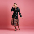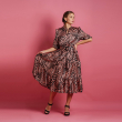 فستان نسائي مطبوع باللون الوردي على شكل حرف A، بياقة مستديرة، وأكمام بطول ثلاثة أرباع، وبطانة مرفقة، وحافة واسعة
