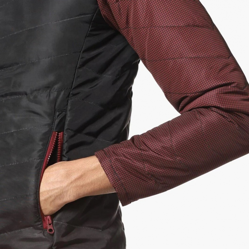 Maroon and Black colourblocked jacket, has a hooded, 2 pockets, zip closure, long sleeves, straight hem, and polyester lining.
