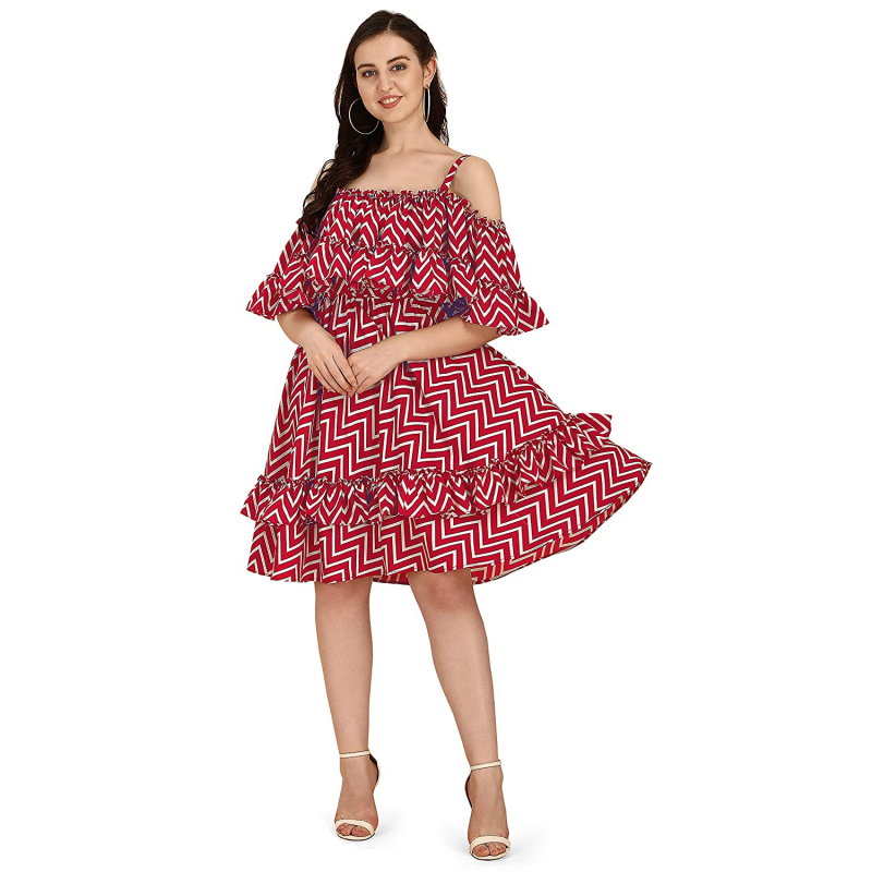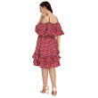 • Playful pleated dress with ruffles on the hem. Off shoulder neck, with noodle straps and ruffled cape