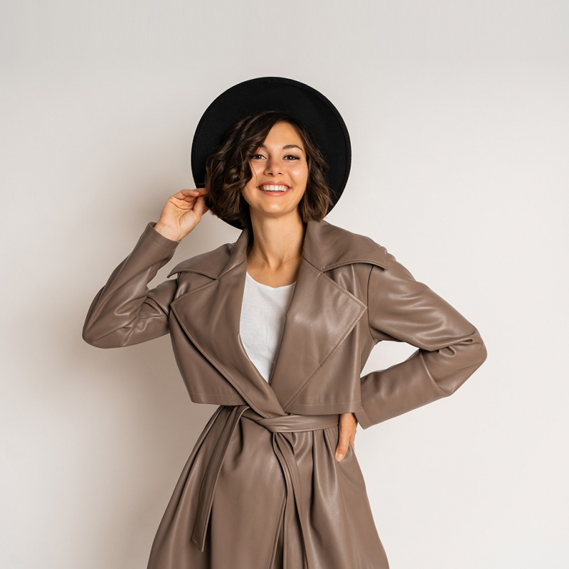 Brown solid faux leather font-open longline trench coat, has notched lapel collar, long sleeves and single vented hem