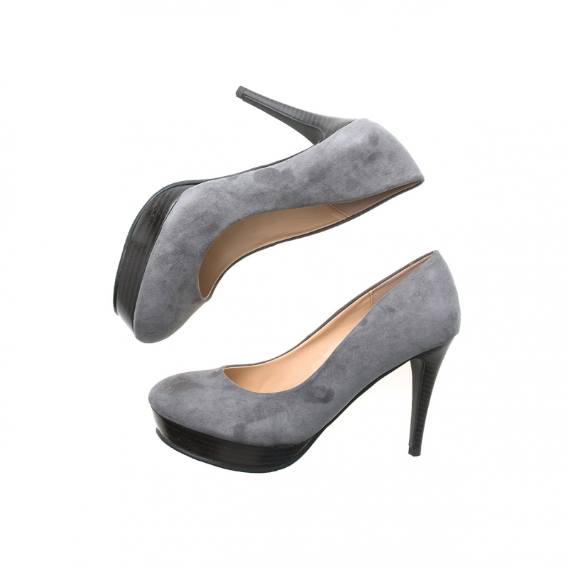 A pair of Grey solid pumps ,has regular ankle and closed back Synthetic solid upper Cushioned footbed Textured and patterend outsole, has a slim heeled